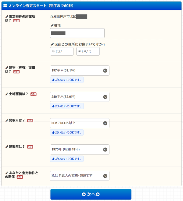 画面が変わって、査定物件の所在地、建物(専有)面積、土地面積、間取り、建築年、査定物件との関係を入力します。